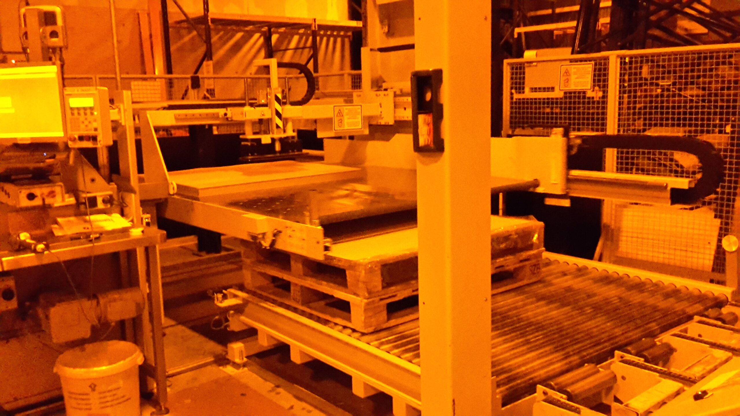 Diese Maschine entstapelt vollautomatisch und ist mit einem Logistiksystem ausgestattet. Fuer das grosse Format