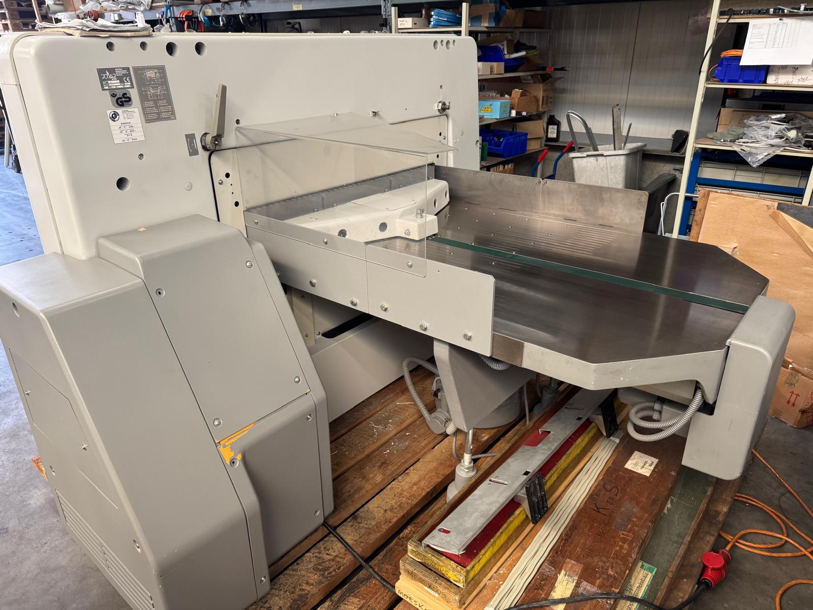 equipped with chrome air table, spare knife, and knife change tools. Includes two 1m² resopal side tables. Reliable and precise cutting machine, ideal for professional print and finishing environments.